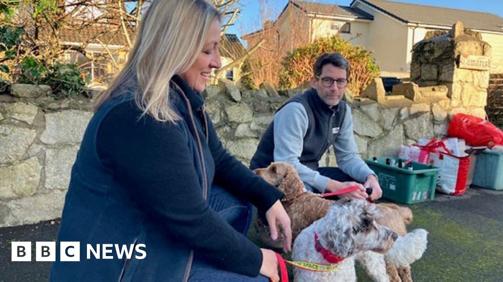 BBC Jen, with blonde hair and wearing blue jacket, and Stuart, with glasses and blue body warmer, sitting with pets Margot (aged 5) and Willow (aged 4). They are outside near stone wall and bins. BBC