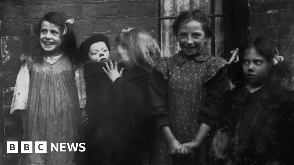 Topical Press Agency/Getty Images/Hulton Archive A black and white archive photo of a group of seven young children, most of them girls, on a cobbled street in Belfast in 1926. Two of the girls are barefoot, one is holding a toddler on her hip. Two others are hiding in an alleyway. The children are mostly smiling. A brick building, possibly a large tenement house, is behind them. Topical Press Agency/Getty Images/Hulton Archive