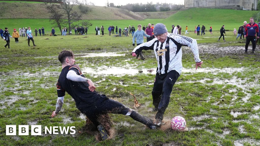 The event, in Alnwick, Northumberland, is played on the fields by the River Aln after a procession from the castle.