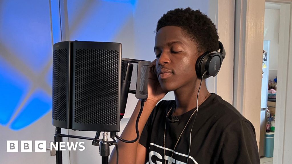 Sam Read/BBC Daniel Chenjerai, known by the stage name DC3, stands with his eyes closed listening to music through headphones as he sings into a microphone in a house.Sam Read/BBC