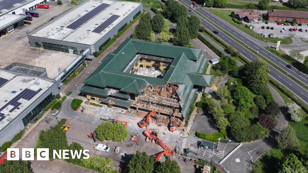 Works began on Tuesday to demolish the striking building with its green roof in Watersmead Drive, next to the junction known locally as the "Body Shop roundabout".