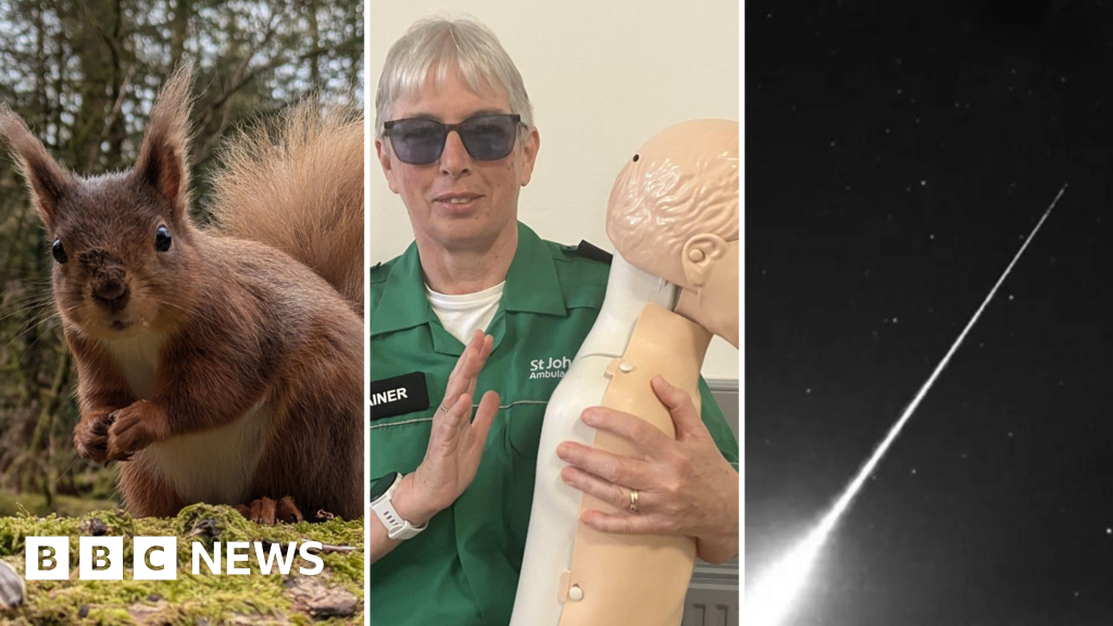 BBC/UK Meteor Observation Network A side by side composite of three separate images: On the left, a red squirrel looks straight ahead, sitting on a mossy branch. In the middle, a woman with white hair, wearing a paramedic's uniform, holds a test dummy. On the right, a meteor, a bright white line of light, is seen crossing a starring night sky.BBC/UK Meteor Observation Network