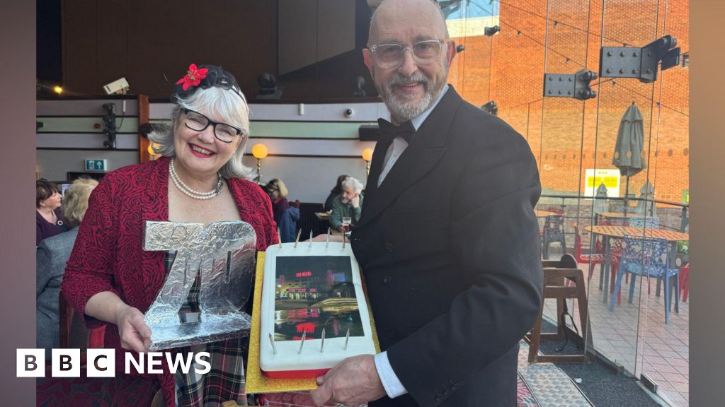 BBC A husband and wife, probably in their 70s in a pub. The man is holding a birthday cake with a picture of a pub at night on it, and the woman is holding a big number "70" made out of silver foil. She is wearing a red and black blazer, floral headpiece, and black glasses, and he is wearing a black and white suit and bowtie. Other people can be seen sat behind them inside, and there is an outdoor seating area lit up by sun on the other side of large panes of glass.BBC