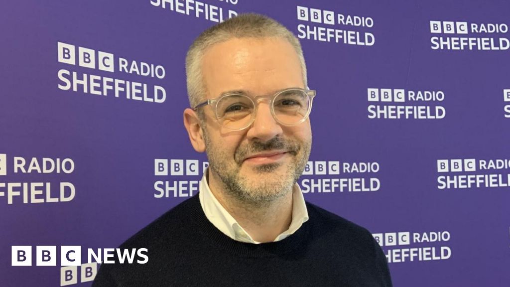 BBC A man with close cropped grey hair has grey stubble and is wearing glasses, a shirt and dark jumper. He is standing in front of a purple wall which says BBC Radio Sheffield.BBC