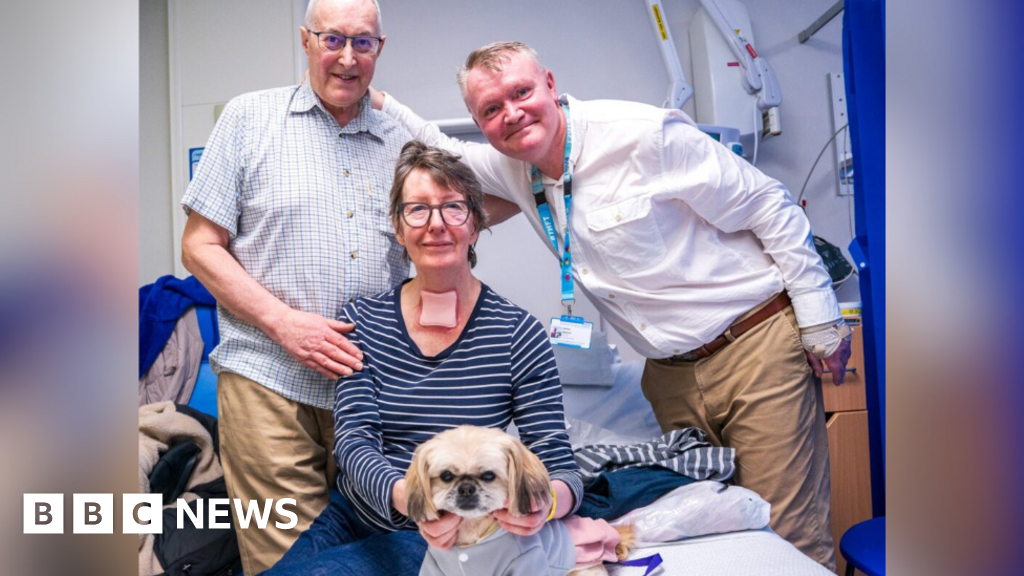 NHS Bradford Teaching Hospitals Three people gathered around a hospital bed, with a woman sitting up and holding a small dog dressed in a light outfit, while two men stand beside her. Medical equipment, a blue privacy curtain and folded bedding are visible in the background.NHS Bradford Teaching Hospitals