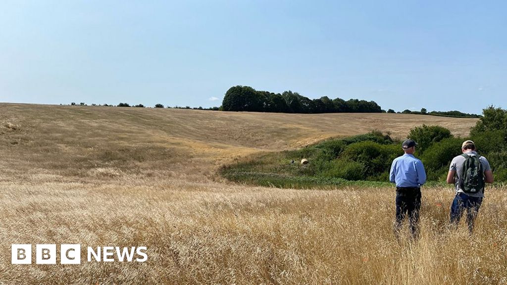 Forestry England Site of the proposed forest at Hagworthingham. Two people stand with their back to the camera in the foreground in front of a small slope which is covered in yellow grassForestry England
