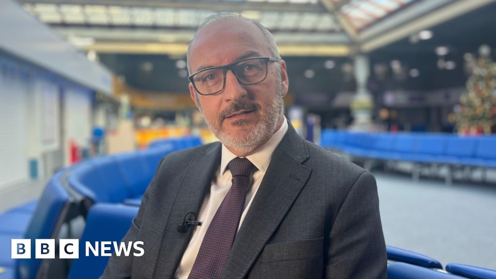 BBC Christophe Mathieu - a man wearing black rectangular glasses, a grey suit with a white shirt and purple tie, sitting on blue chairs in the harbour ferry terminal.BBC