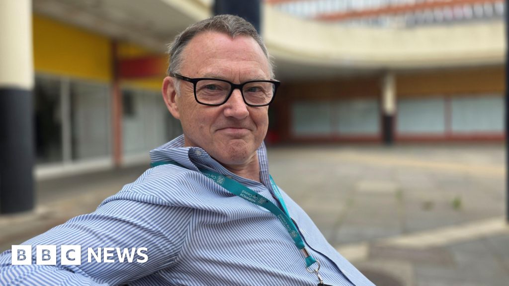 Paul Moseley/BBC Mike Stonard is sitting on a bench in Anglia Square. He's wearing a blue and white pinstripe shirt along with a light blue lanyard. He also is wearing glasses.Paul Moseley/BBC