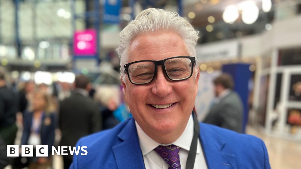 BBC Kevin Bentley with grey hair and large black-framed glasses smiling at the camera in a bright blue suit. He is in a conference hall which is out of focus behind him.BBC