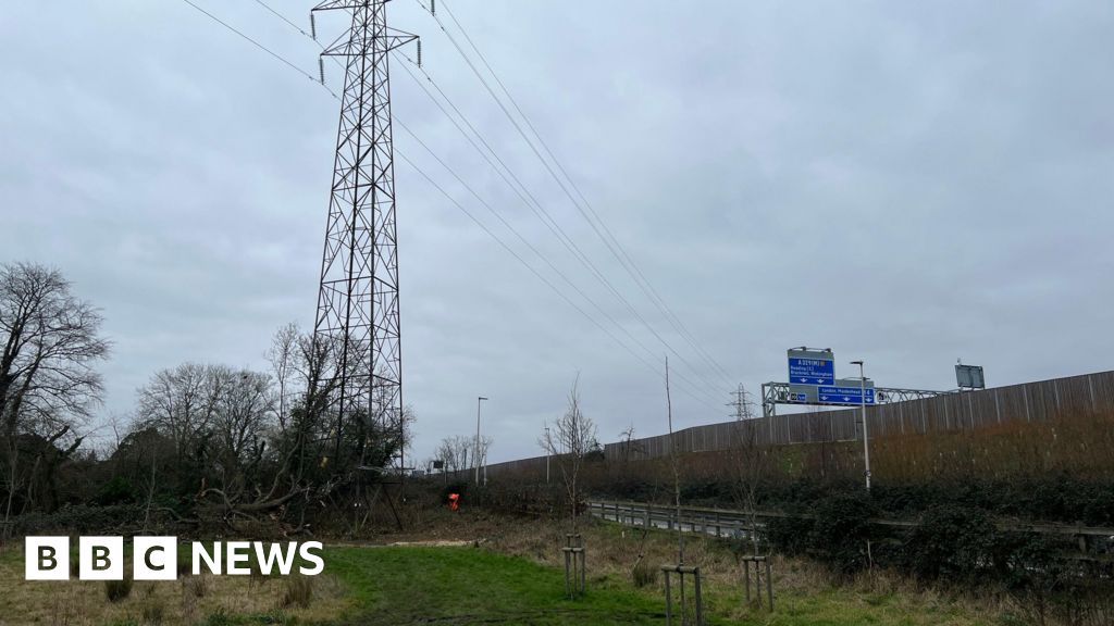 BBCThe M4 will remain closed in both directions for a "considerable period" in Berkshire after an oak tree fell onto the base of an electricity pylon, according to National Highways.
