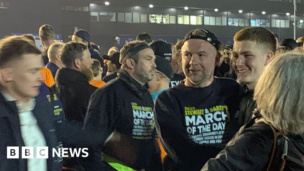 BBCHundreds of people gathered at a football club to welcome walkers finishing a 178-mile march (286km) to raise money for motor neurone disease (MND) research.