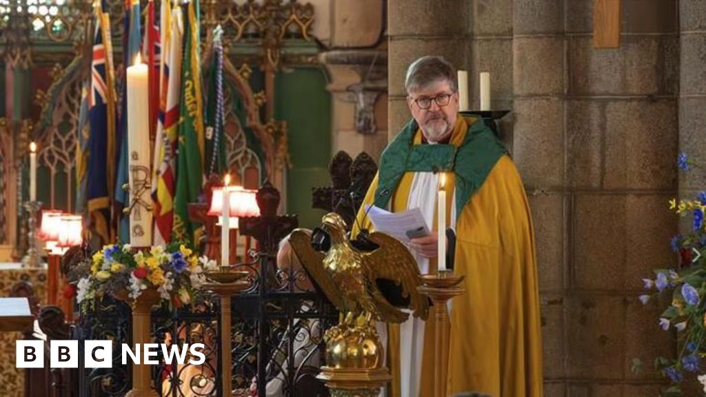 Government of Guernsey Tim Barker standing at the lectern of a church holding a sheet of paper while leading a service. He is wearing yellow and green vestments. There are candles ad flowers in the churchGovernment of Guernsey