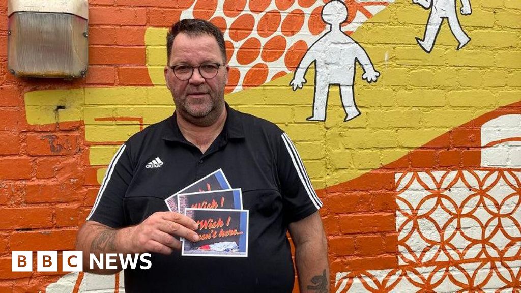 Sifa Fireside A man wearing glasses and a black Adidas t shirt holds postcards with Wish I wasn't here written on them. The cards also depict someone sleeping in a doorway. He is standing in front of a brightly painted orange and yellow wallSifa Fireside