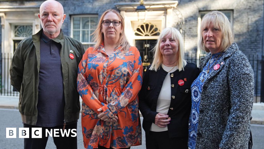 PA Media Steve Kelly, who has a bald head, white stubble and a green jacket, Charlotte Hennessy, with light ginger hair and wearing an orange floral dress, Margaret Aspinall, with shoulder length blonde hair and a black jacket, and Sue Roberts, who has blonde hair and a grey and black woollen coat, all stand looking into the camera with determined expressions with the black door of Number 10 Downing Street in the backdrop.PA Media
