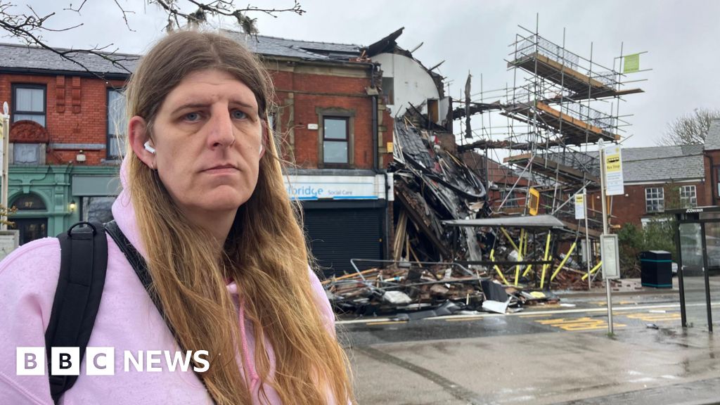 Mat Trewern/BBCA woman who was standing at a bus stop close to a building that partially collapsed in Oldham has described hearing "cracking and rumbling" before seeing it start to fall.