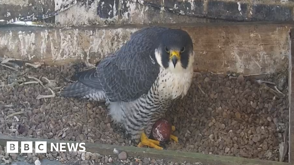 The bird of prey, which has made its home at the Grade II-listed building in Leamington Spa, Warwickshire, was spotted with the egg on Tuesday.