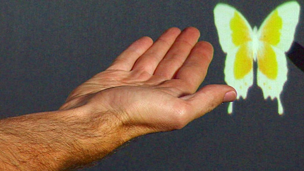 Spencer Kelly looks at one of the exhibits that lets you hold a virtual butterfly in your hand as you make a wish for the future.