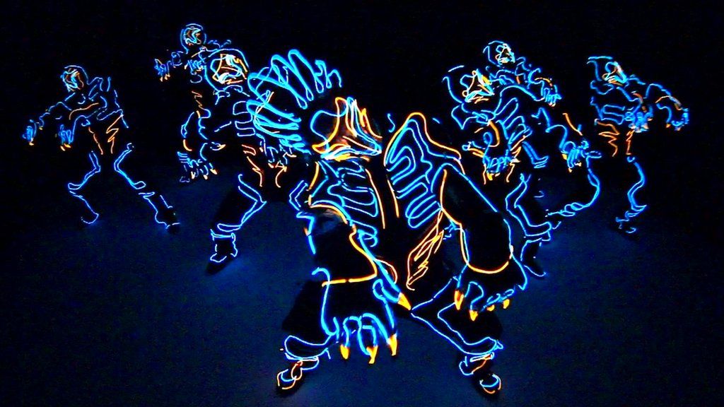 The dancers have nearly 30m (100 ft) of electroluminescent wire wrapped around their costumes to ensure a very bright performance. The crew also maintain their own suits.