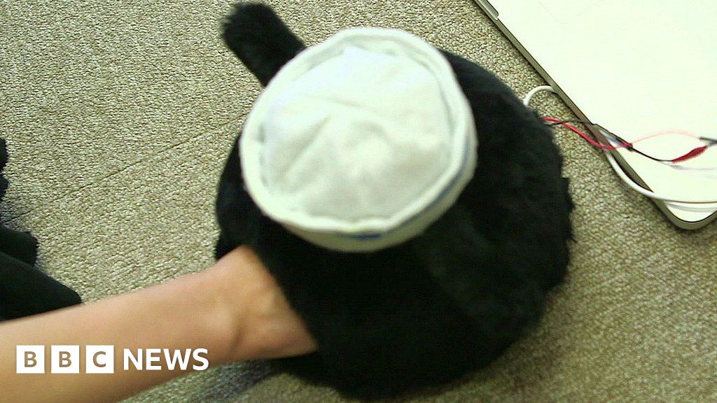 The internet links to the two devices so that the cat owner feels a scratch on the hand.