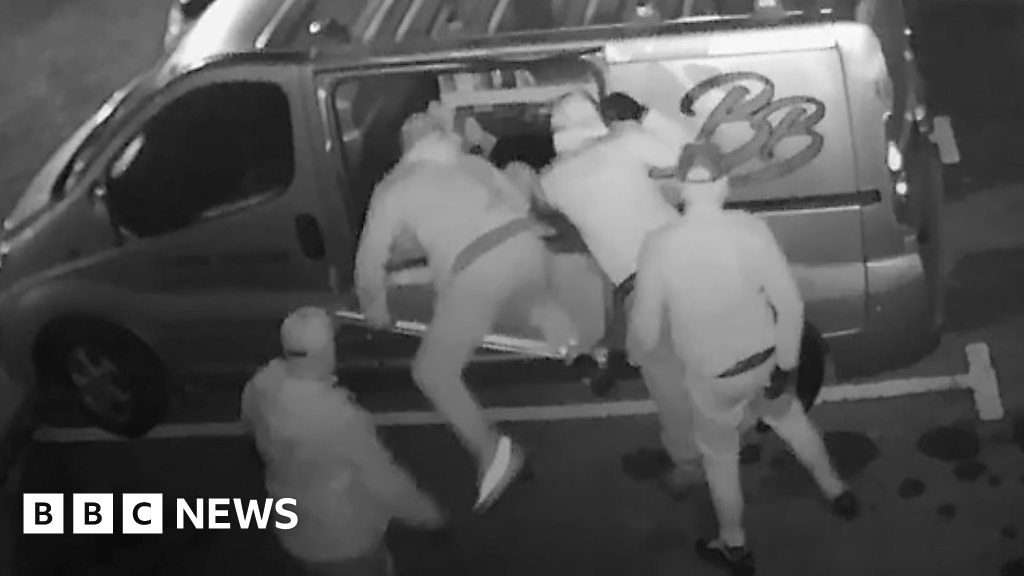 Four masked men have been captured on CCTV tearing into the side of a van in rapid time to steel tools inside.