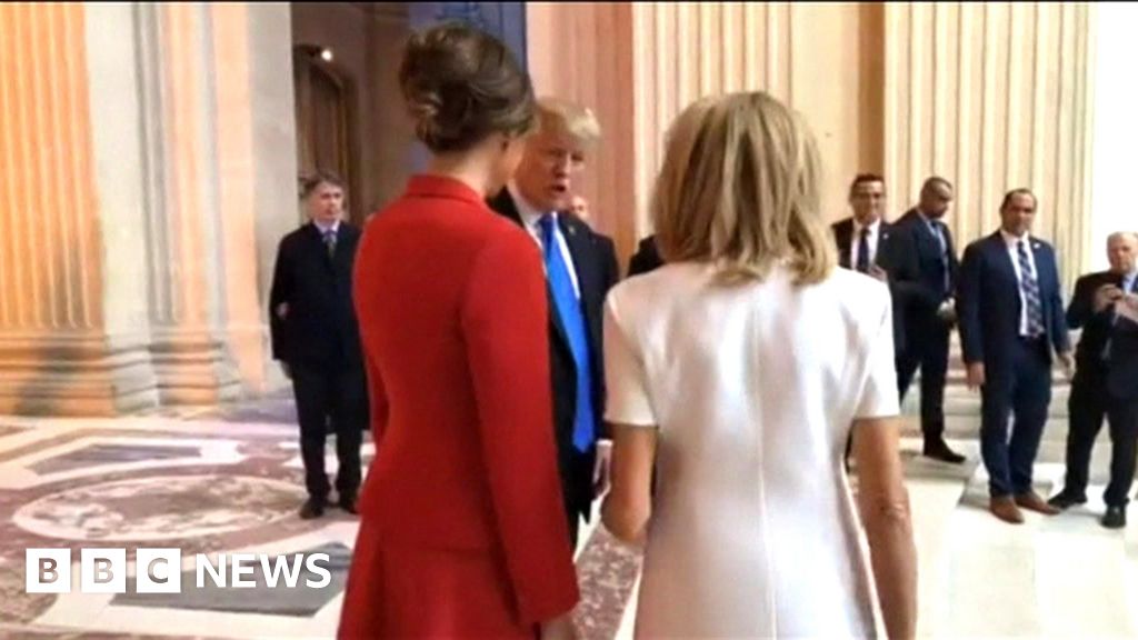 The US president paid the compliment to France's first lady, Brigitte Macron, as the two couples chatted in Paris.
