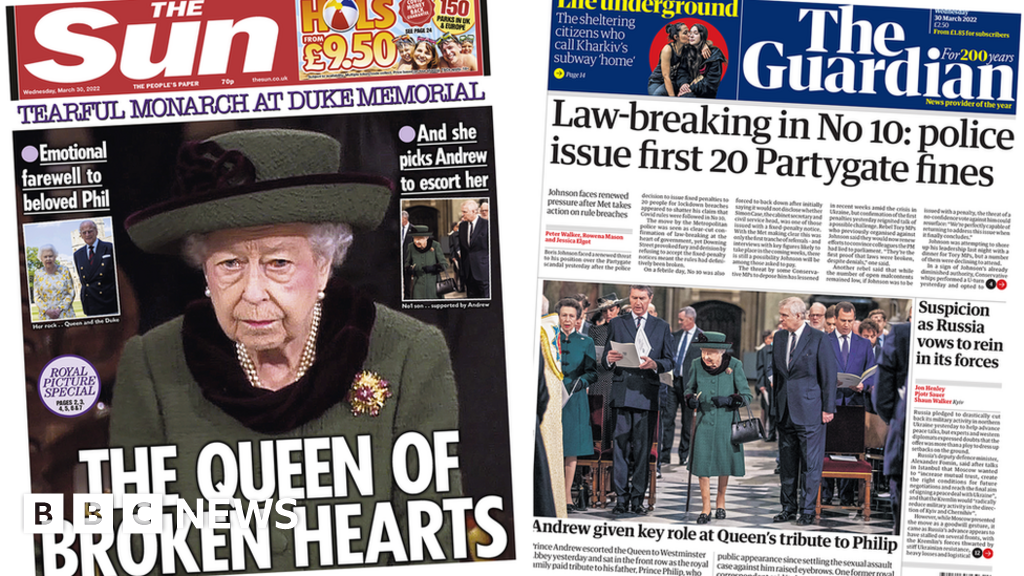 AFPThe Queen - her eyes shining with tears, at Tuesday's memorial for the Duke of Edinburgh - appears on a number of the front pages. The Sun calls her the "Queen of broken hearts". The papers also carry pictures of her being escorted to her front row seat in Westminster Abbey by the Duke of York.