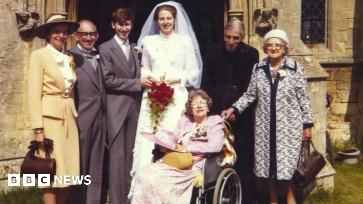 May family handout of Theresa May at her wedding to Philip in 1980. From left - Philip's parents, John and Joy May, Philip and Theresa, Theresa's father Hubert, maternal grandmother Violet Barnes, and mother Zaidee in the wheelchairImage source, Theresa May