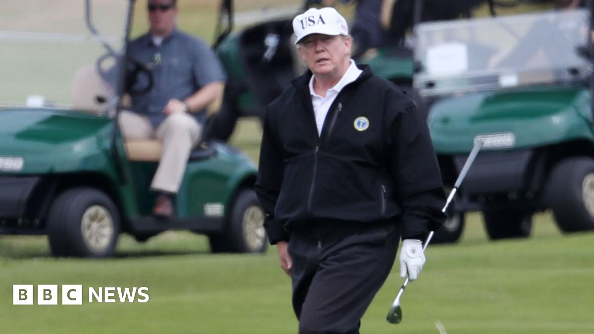 President Trump is out on the fairway at Turnberry, and plenty of protestors have gathered on the edge of the course.