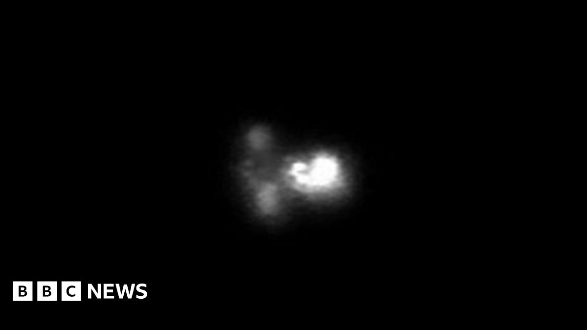 The spacecraft is seen moving left to right in the video. The bulbous shape of its fuel tanks and its outstretched solar panels are easily discernable.