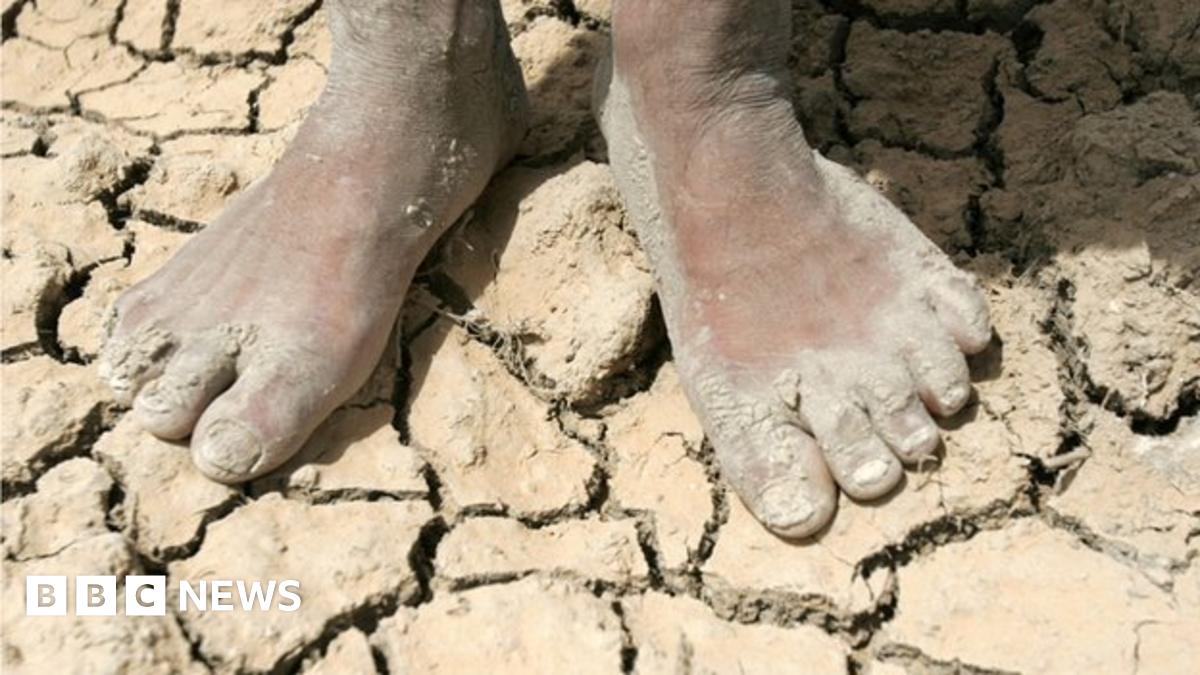 A boy stands on parched earth in a dry field on the outskirts of Najaf, Iraq