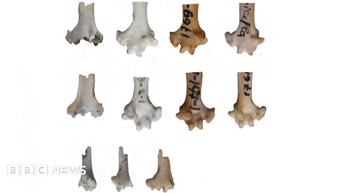 The researchers compared the Siberian parrot fossil bone (top left) with other birds
