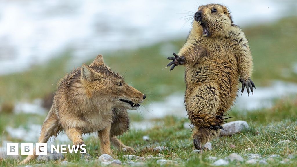 The fox has surprised the marmot and a fight is about to begin that will result in the rodent being killed.
