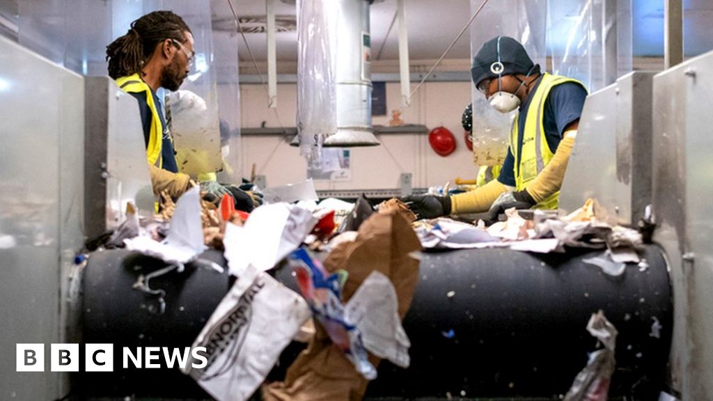 From a metal gantry high above the factory floor I watch bits of cardboard, shards of billowing plastic and other ephemera hurtle down a conveyor belt. The whirr and clank of machinery fills the air, and there's a slight whiff of garbage as a truck disgorges a steady stream of recycling on the floor.