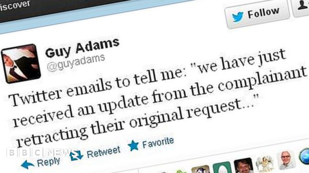 Mr Adams said Twitter had told him that his account <link> <caption>had been reactivated following</caption> <url href="https://twitter.com/guyadams/status/230359474655870978?tw_p=twt" platform="highweb"/> </link> "an update from the complainant retracting their original request".