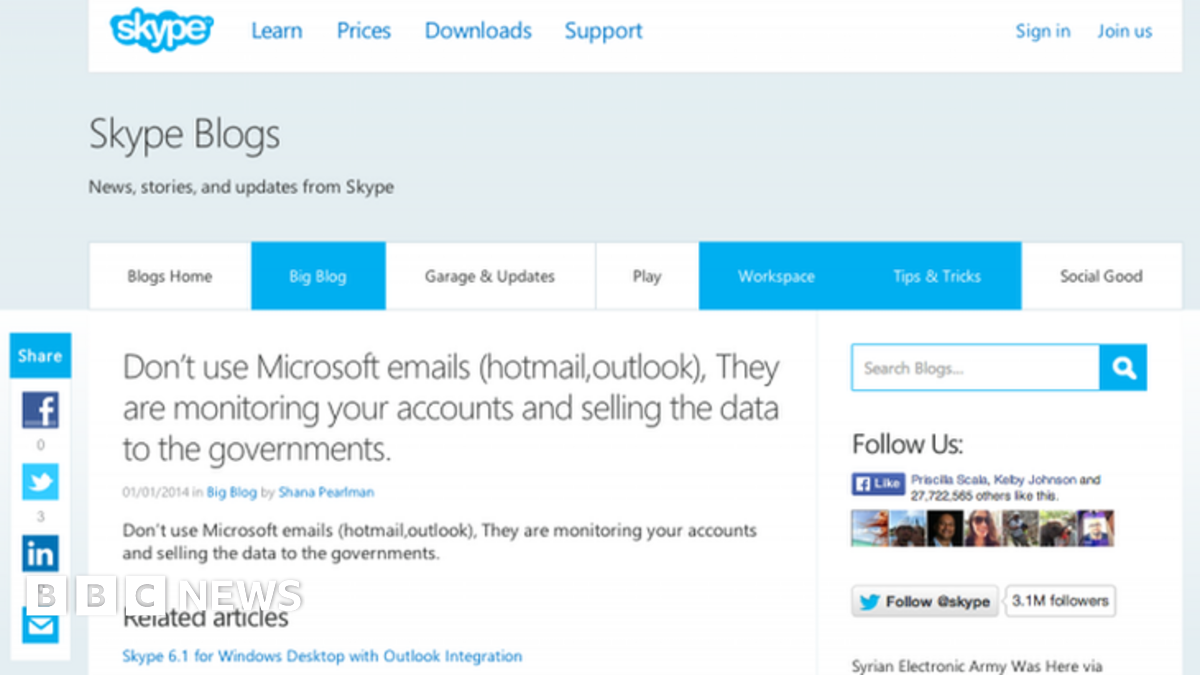 "Don't use Microsoft emails (hotmail, outlook). They are monitoring your accounts and selling the data to the governments," the hackers posted on Skype's Twitter account and its blog.