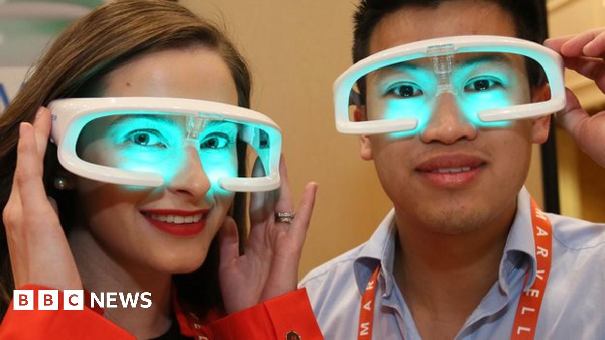 Ben Walsh of UK company SunnyCam glasses shows BBC technology correspondent Mark Gregory how the glasses work