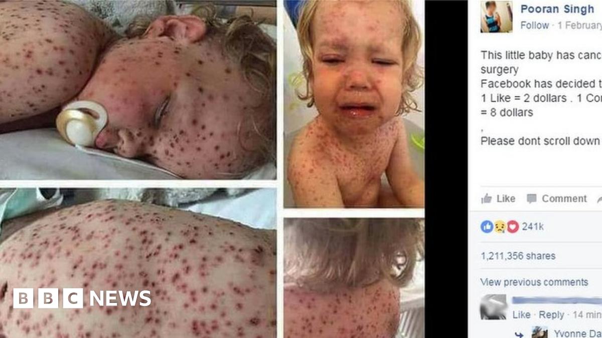 Other posts from the accounts showed images of children in hospital claiming that viewers would experience years of bad luck if they scrolled down without liking and sharing.