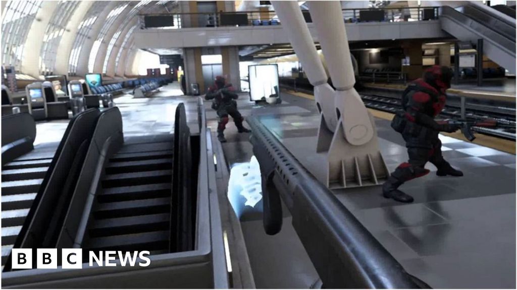 The game allows the player to shoot imaginary weapons against enemies in a public train station.
