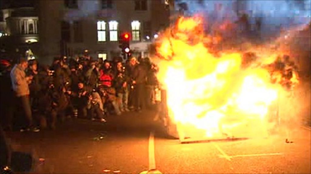 Student demonstrators clashed with police in Westminster as MPs debated plans to raise tuition fees to £9,000 a year. Fires were lit and flares set off.