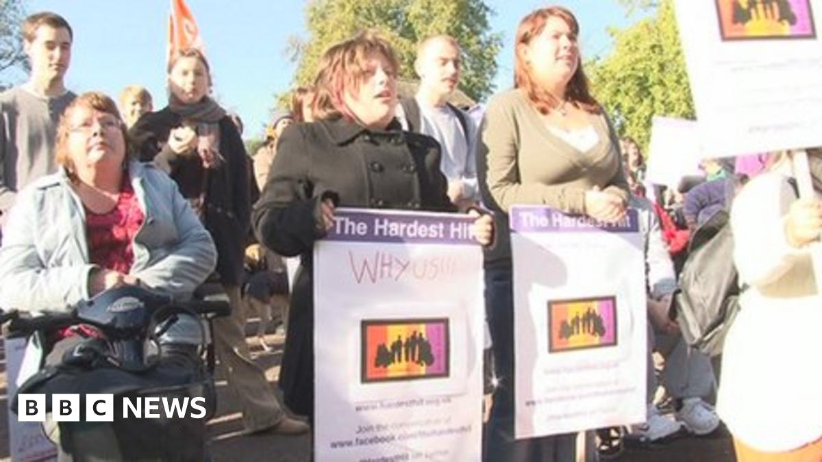 Protesters object to benefit changes, including cuts in disability living allowance, and local service cutbacks.