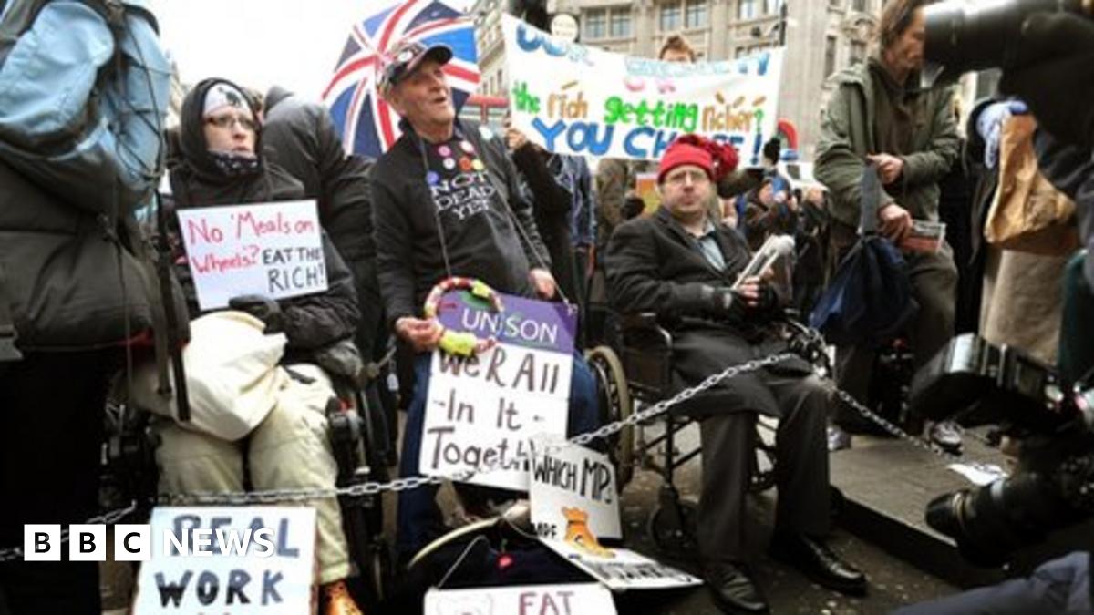 UK Uncut said 15 wheelchair users chained themselves together in Oxford Circus at about 12:00 GMT, blocking traffic in part of Regent Street until about 14:30. They were supported by about 250 people, a spokeswoman said.