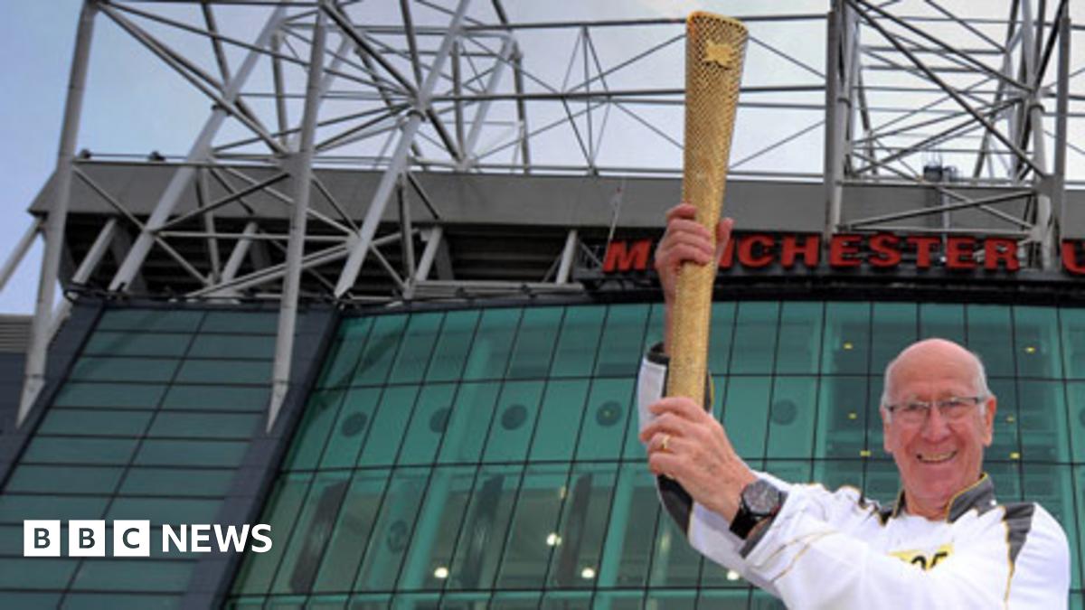 Football legend <link> <caption>Sir Bobby Charlton</caption> <url href="http://www.bbc.co.uk/news/uk-england-manchester-18532570" platform="highweb"/> </link> carried the Olympic torch past Manchester United's Old Trafford stadium on day 37 of the relay.