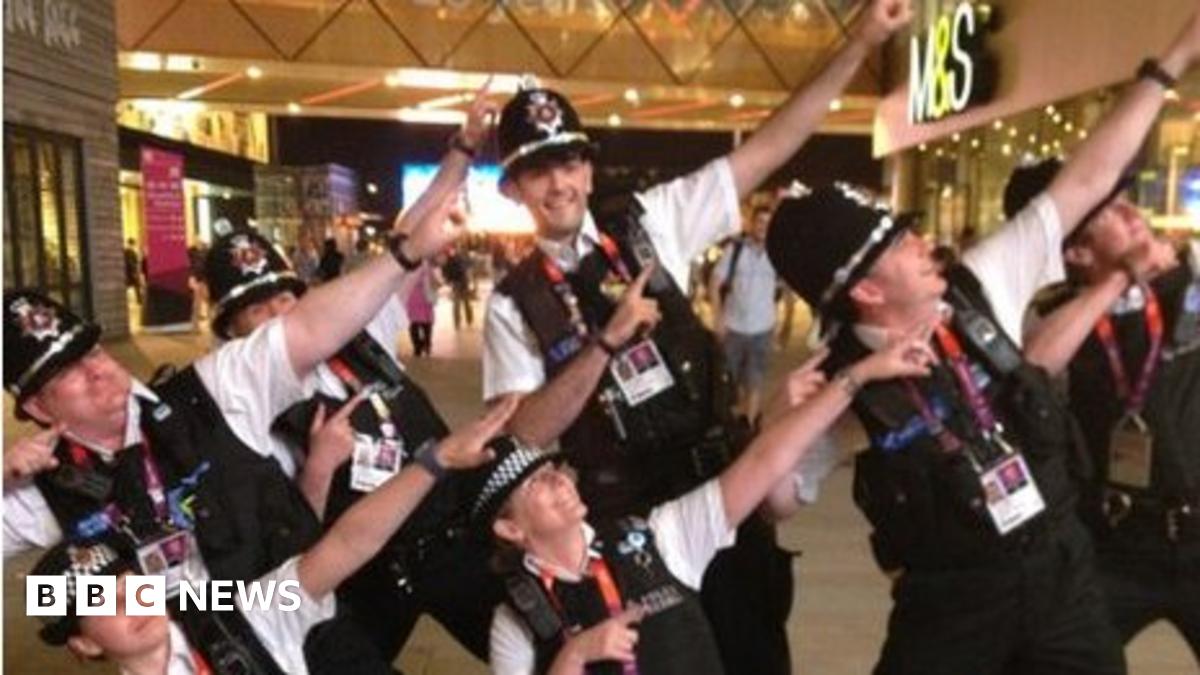 Officers strike Bolt's To di World pose just outside the Olympic Park