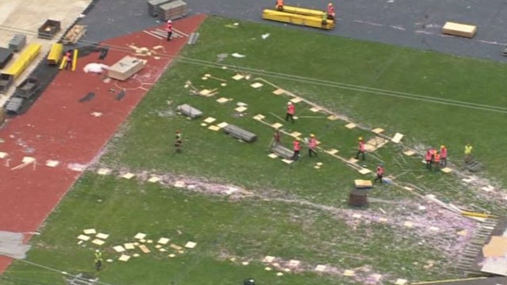 Aerial footage shows the stage, which was used during the closing ceremony, being dismantled in order to put the athletics track back in the stadium ahead of 29 August.
