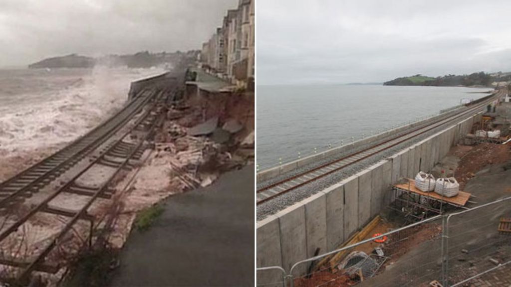 About 260ft (79m) of sea wall was destroyed by high tides and stormy seas on 5 February causing a stretch of railway to collapse.