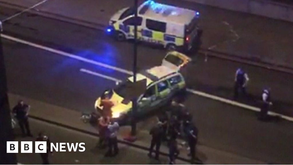 Emergency services are seen on London Bridge in the minutes after a van struck pedestrians.