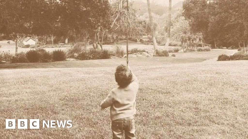 The sepia-toned picture, taken on Thursday, shows the toddler standing in a garden with his back to the camera, holding a large bunch of balloons.
