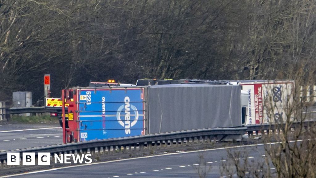 Two lorries were blown over on the M4 westbound between junctions 37 at Pyle and 38 at Groes, with the motorway closed in both directions and diversions in place.