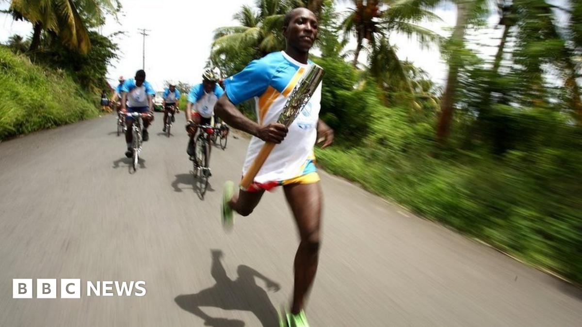 Sprinter Joy Edwards holds the Queen's baton at Fond Assau Combined School in Castries, Saint Lucia.