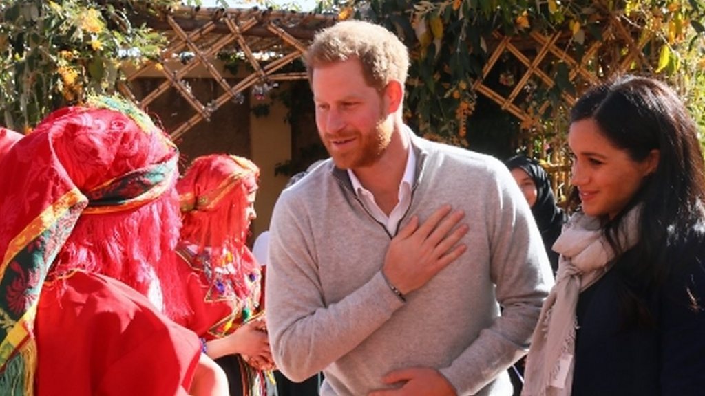 Harry jokes with Meghan during a visit to an education charity in Morocco. The Duke and the Duchess of Sussex's visit aims to support girls' schooling.